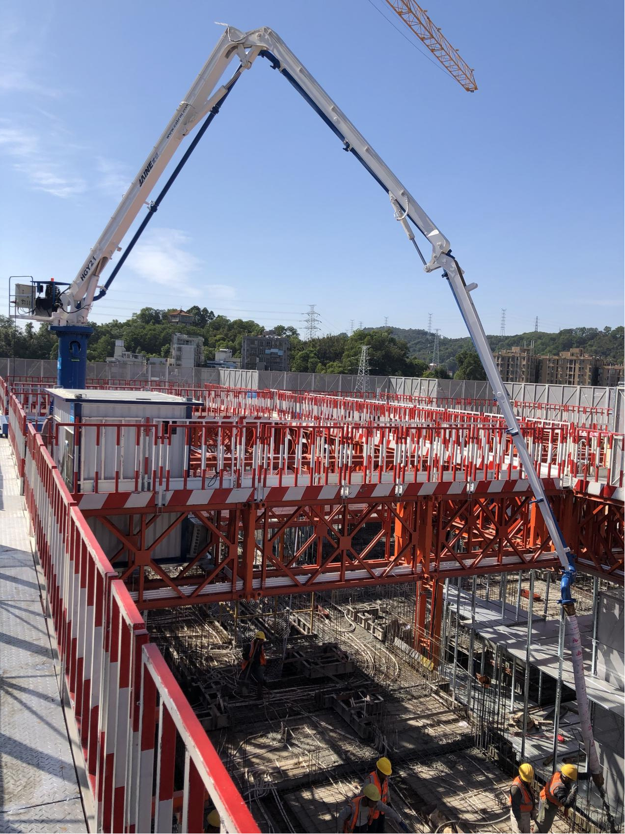 模架式液壓混凝土布料機自帶鋼平臺底座,與爬模架體連接傳遞施工載荷,無需自帶動力系統(tǒng),爬模爬升時帶動其爬升。其中HGY21模架式液壓混凝土布料機于2021年11月成功應用在使用“住宅造樓機”的裝配式建筑領域(中建三局承建的廣州大源村項目)。