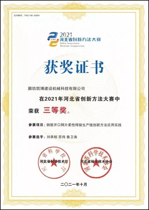 廊坊凱博建設(shè)機(jī)械科技有限公司(以下簡(jiǎn)稱“凱博科技”)完成的“鋼筋開(kāi)口網(wǎng)片柔性焊接生產(chǎn)線創(chuàng)新方法應(yīng)用實(shí)踐”項(xiàng)目在2021年河北省創(chuàng)新方法大賽中榮獲三等獎(jiǎng)。此次參賽是凱博科技創(chuàng)新團(tuán)隊(duì)第二次參加河北省創(chuàng)新方法大賽,2019年凱博科技“教學(xué)型塔式起重機(jī)”項(xiàng)目曾獲“2019河北省創(chuàng)新方法大賽三等獎(jiǎng)”。